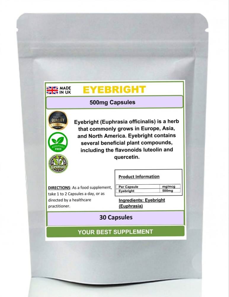 Eyebright High Strength Supplement. Each capsule contains pure highest quality Eyebright (Euphrasia), no additive or fillers.